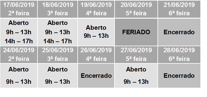 Excecionalmente, por motivos de força maior, o Centro Clínico de Faro, no período de 19 a 28 de junho, só estará aberto nos períodos indicados.