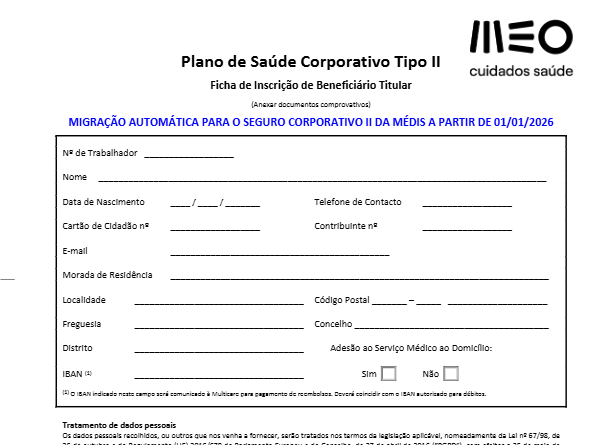 1. Nº de Trabalhador na Entidade Empregadora (Titular) __________________ Nome do Familia r ________________________________ _______ ____________________________________________ Data de Nascimento ____ / ____ / _______ Género : Masculino X X Feminino X X Cartão de Cidadão n º __________________ Contribuinte nº __________________ Assinalar com uma cruz (x) a situação do familiar a inscrever XX Filho ou equiparado X X União de Facto X X Cônjuge ... Data de Casamento ____ / ____ / _______ Tratamento de dados pessoais Os dados pessoais recolhidos, ou outros que nos venha a fornecer, serão tratados nos termos da legislação aplicável, nomeadamente da Lei nº 67/98, de 26 de outubro e do Regulamento (UE) 2016/679 do Parlamento Europeu e do Conselho, de 27 de abril de 2016 (“RGPD”), com efeitos a 25 de maio de 2018. E ste tratamento tem como finalidade a adesão ao Plano de Saúde Corporativo II e a operacionalização e prestação dos serviços inerentes a este Plano, Estes dados são indispensáveis e de fornecimento obrigatório e serão tratados pela MEO – Associação de Cuidados de Saúde (“ MEO – ACS”). Os dados que sejam estritamente necessários serão partilhados com o beneficiário titular do Plano. Os seus dados poderão também ser transmitidos a entidades parceiras, para efeitos de operacionalização e prestação dos serviços contratados, bem como a outra s entidades, nos termos legais aplicáveis e afetando os dados estritamente necessários, nomeadamente Autoridades Tributárias e Tribunais. Os dados serão conservados pelo período de tempo necessário à prestação dos serviços. É garantido o seu direito de acesso, retificação e atualização através dos co ntactos disponibilizados pelo MEO Cuidados de Saúde . O MEO Cuidados de Saúde protege a sua privacidade e toda a informação que nos disponibiliza, incluindo os seus dados pessoais, nos termos da respetiv a Política de Privacidade disponível em meocuidadossaude .pt e que deve conhecer e rever periodicamente. Declaração de Inscrição no Plano de Saúde Declaro ter conhecimento integral das regras e condições relativas ao Plano de Saúde, ao qual tive acesso e ao qual pretendo aderir, cujo regime aceito sem reservas e por cujo cumprimento integral me responsabilizo. Declaro ter lido e entendido a informação constante desta Ficha de Inscrição pelo que assumo a inteira responsabilidade de al guma omissão ou inexatidão dos dados pessoais ou demais informações prestadas. Reconheço e aceito a necessidade da partilha dos meus dados com o beneficiário titular do Plano no âmbito e para efeitos da execução do mesmo. Declaro ter conhecimento e aceito que os cofinanciamentos deste Plano serão debitados ao beneficiário titular. Mais declaro autorizar o registo e tratamento, designadamente informático , dos dados para operacionalização do plano de saúde e a respetiva transmissão a entidades parceiras, no âmbito e para a prestação dos serviços contratados, bem como a partilha com outras entidades, decorrente de exigências legais, nomeadamente Autoridades Tributárias e Tribunais. Da ta ____ / ____ / _______ As sinatura do Beneficiário _________________________________________ ____________________________________ (obrigatório para > 1 8 anos) (conforme Cartão de Cidadão) As sinatura do Titular _____________________________________________________________________________ (conforme Cartão de Cidadão) Plano de S aúde Corporativo T ipo I I Ficha d e Inscrição d e B eneficiário F amiliar Regime Especial (Anexar d ocumentos com provativos) MIGRAÇÃO AUTOMÁTICA PARA O SEGURO CORPORATIVO I I DA MÉDIS A PA R TIR DE 01/01/2026